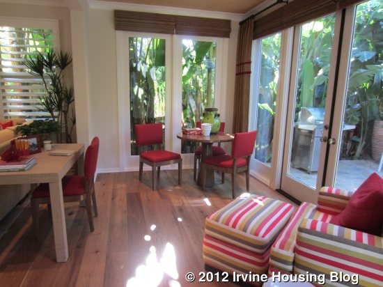 The backyard is similar in size to the other models, with a long narrow layout. In this model, they demonstrate the standard trellis setup, which is basically just a basic patio cover with slats. It is still nestled against the house, sharing walls with the great room and dining area, but open on the other two sides. This option is the least like an indoor room and is best for someone looking for a casual backyard and also doesn’t need or want the extra space inside.