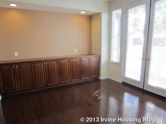 Beyond the living room is a large dining room that includes a full wall of cabinets. These will come in very handy, as the kitchen is fairly small and doesn’t have a lot of storage. The dining room is wide, with space for a large table, and also has access to the side patio.