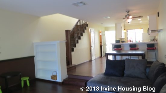 The living room is a couple steps down from the rest of the first floor, which clearly defines the area. The step is a small size, only running a small portion along the different levels; therefore something will need to visibly separate the areas to avoid someone from stepping off a portion that does not have the step. The living room is a nice size with a fireplace and built in bookshelves.