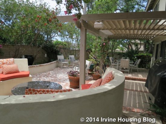 The backyard is nicely hardscaped with a built-in curved bench wrapping around a fire pit, concrete and brick patio, as well as two lattices over each of the sliding glass doors. The backyard sits higher than the street, so there is a sense of privacy, however the street noise can easily be heard from the yard. There is no grass in the backyard, but plenty of space for entertaining.
