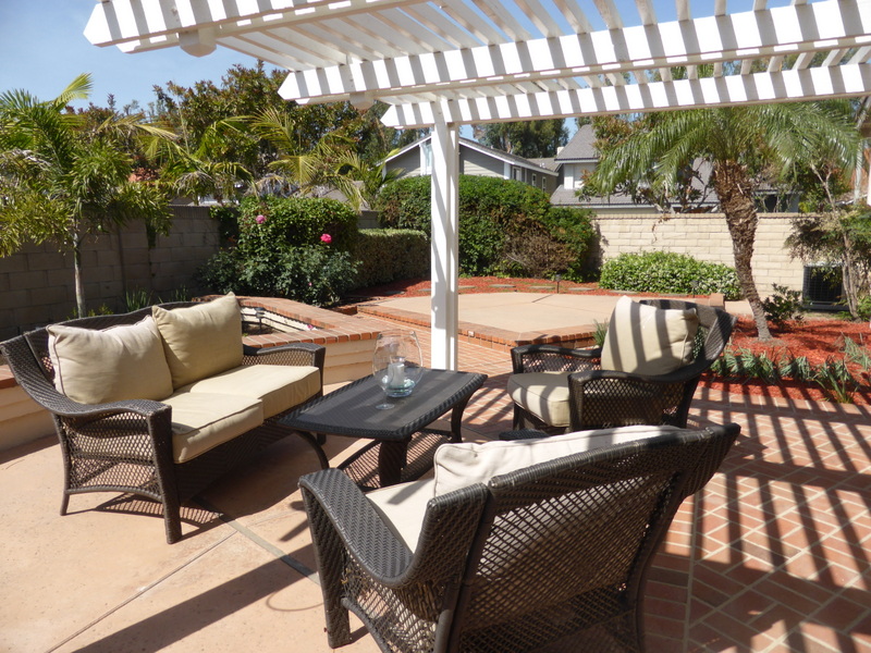 The backyard of this home is mostly hardscaped in a combination of concrete and brick. It has different levels that break up the space.