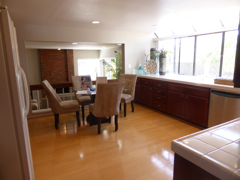 The front entry has wood floors and a small coat closet. The wooden rail that divides the hall from the living room (as seen in 1 Brillantez) was removed, creating a more free-flowing space. The living room, however, is carpeted, so there is a visual separation. It has vaulted ceilings, a huge window facing the front of the home, and smaller windows on the side.