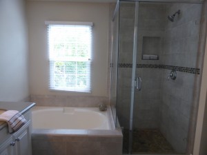 The master bath has been nicely remodeled. Its tile floors match those from downstairs and a window over the tub makes it feel bright. The vanity has Caesarstone counters, two sinks with brushed nickel hardware, and two sets of white cabinets with a few drawers between them. The soaking tub and shower sit side-by-side, with a shared deck offering a narrow ledge in the shower. Both have light gray tiles and the shower has a band of decorative tiles as well.