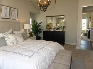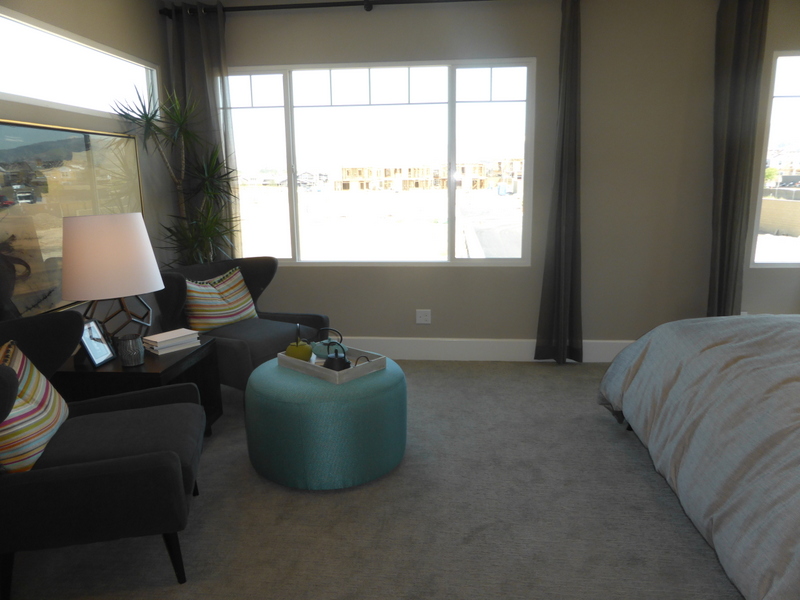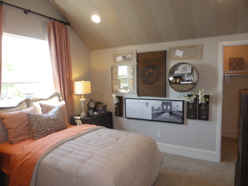 The main floor bedroom is an average size. It has a large walk-in closet with extra storage under the stairs. The room is modeled with the optional sliding doors to the backyard instead of the standard windows. The decorative wall is upgraded as well.