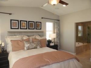 The master suite is across the hall, facing the back of the house. The bedroom is a good size, but as it only has windows on one wall, it doesn’t have as much natural light. A small nook in the corner offers a tiny window. There is an option for a shelf there, though it isn’t shown in the model. One of the suite’s walk-in closets is off the main bedroom and is shown with upgraded built-ins. Long and narrow, this one is the larger of the two closets and is designated “hers” on the floor plan.