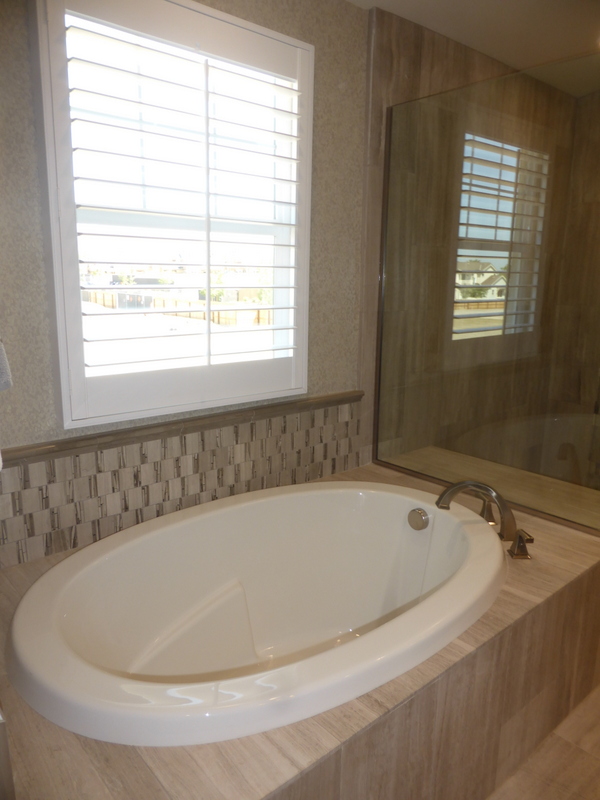 Both secondary bedrooms share a bathroom in the hallway. It shows the optional double sinks, rather than the standard single. The vanity is pretty long so there is definitely space to easily fit both sinks. An optional door separates the sinks from the rest of the bathroom. The model shows the standard shower/tub combo (albeit with upgraded tile), but a shower-only option is available, as in the other models.