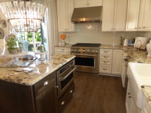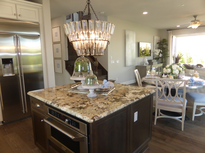 The open kitchen is right behind the dining room. The long center island offers bar seating for at least four people; the other side is lined with cabinets and drawers. A very long counter along the back wall includes the sink, dishwasher, ample counterspace, and numerous cabinets. It also has one set of pantry-height cupboards. The shorter side wall has the cooktop, oven, microwave, fridge and a few additional cabinets. There wasn’t an available list of upgrades, so I don’t know whether the cabinet and granite colors are among the included choices or not (though I would guess both are standard options).