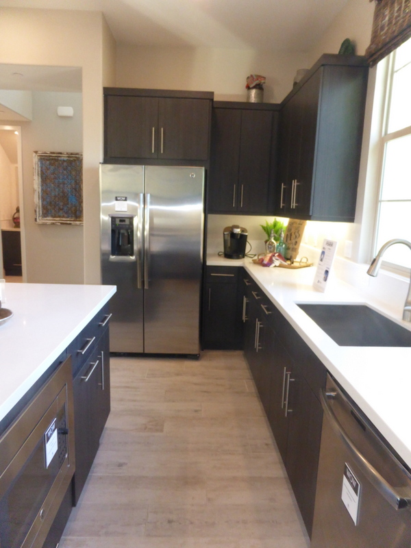 If you walk straight through the foyer, you come to the great room and kitchen. The great room is 17′ x 15′ and is shown with upgraded flooring. Windows face the back and sliders on the side lead to a covered patio. The room is furnished somewhat awkwardly, making it seem more cramped than it really is.