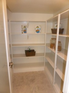 The kitchen is adjacent to the dining nook. It’s a lot smaller than the kitchen in residence one (9′ x 15′ vs 12′ x 17′), but still has adequate space. The center island houses the sink and dishwasher and has bar seating for three or four people. One long counter has most of the cabinetry, the cooktop, the oven, and another low-mounted microwave. Since it isn’t in the island this time, I really don’t know why they went with the lower microwave; I actually think it would have been better to have another low cabinet, rather than the extra upper. The fridge is on a shorter wall, with a bit of counter space and a set of cabinets next to it. The walk-in pantry is big, with plenty of shelves. It has slightly lower ceilings, as it sits partly beneath the stairway.