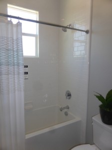 The secondary bathroom is just across from the laundry room; it is shared by the two secondary bedrooms. The vanity is fairly small, with just one sink and not much counter space. The shower/tub combo shows the included full-height white tile.