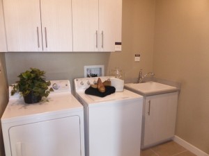 On the second floor, the rooms all come off of one hallway. The laundry room is right across from the stairs and is similar to the ones in the previous models, though somehow with even less counter space around the sink. There are additional linen cupboards in the hallway near the bedrooms.