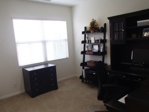 At the end of the hallway is the large master bedroom. The bedroom is unique by having both a sleeping area and a separate area that could be used as an office, reading area or separate space to watch television. The master bathroom has a privacy door. Immediately to the right is the walk-in closet and to the left are dual sinks, a large soaking tub, shower and a separate toilet. Like the shared bathroom, the cabinetry and countertop are a basic white and has a decorative backsplash.