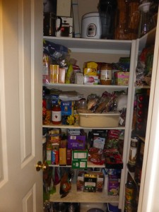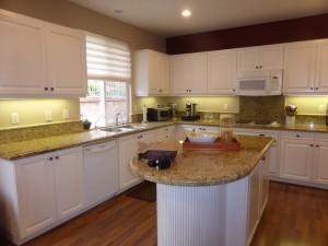 The kitchen is on the other side of the dining room. It is quite large for homes in his neighborhood and more open than most of the other models. It has granite counters with white cabinetry. The center island could fit a couple of bar stools. One wall includes the sink and dishwasher. Another holds the microwave, oven, and four-burner cooktop, and the refrigerator sits on the third wall. The appliances are white and the room has ample counter and cabinet space. A short hallway off the kitchen leads to the pantry and access to the two-car garage.