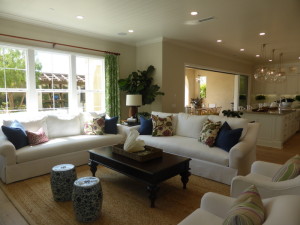 Residence 1 is modeled in the Santa Barbara elevation, with the sales office replacing the garage. The home has a front porch and a huge foyer, with room not only for an entry table but for a baby grand piano as well. There is a double-door coat closet on the left. Upgrades found throughout the model include alarm system with motion sensors, flooring, upgraded crown moulding, paint grade cased windows, upgraded interior wall paint, front and rear yard hardscape and landscaping, paint grade stool and apron, window and wall treatments, and all decorator’s items including light fixtures, recessed lighting, and J-boxes for ceiling fixtures.
