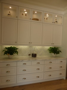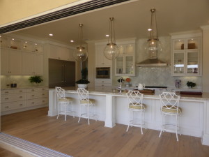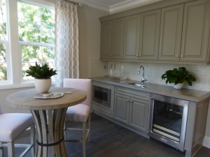 The kitchen is across from the great room. It is dominated by an extremely long island that could easily sit 6 – 8 people. The island also includes numerous drawers and cabinets, the sink, and the dishwasher. The range sits in the middle of the kitchen’s longest wall and is surrounded by large drawers, upper cabinets, and ample counter space.  The built-in microwave sits at the end of the wall. The refrigerator is on the shorter wall, next to several additional cabinets and more counter space. A second refrigerator replaces pantry-height cupboards. The sink is an upgraded Kohler apron farmhouse sink. There is an upgraded Thermador appliance package including the dishwasher, 6-burner range with griddle, canopy hood with motor, and microwave. The two built-in Thermador refrigerators with bottom freezer are also upgraded. However, this kitchen also shows some of the standard features, including the countertops (choice of 2 granite colors or 4 Quartz colors), backsplash, edge detail, faucet, and white cabinetry. Cabinets with glass doors are upgraded. The home comes standard with sliding doors leading to the California room but is shown with the optional 5-panel stacking door.