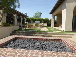 This home is on a 7,900 square foot lot, so it falls in the middle of the range for the neighborhood. The yard is really interesting. There is a standard California room bordering the great room and dining rooms. Behind that is a sunken patio with a built-in fireplace. There is a covered patio at the rear of the yard with a unique fountain – the water pours off the roof so it looks like a wall of rain. The patio is accessed by stepping across stone pillars surrounded by water. In the back corner of the yard is another landscaped area.