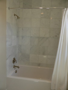 Bedroom 4 is at the end of the hall and is the biggest of all the secondary rooms. Two windows face the street and have a small alcove below them. Another window faces the side of the house. This room also has a walk-in closet and en-suite bathroom. The bathroom is off the entryway of the room, so it doesn’t take away any wall space. The vanity is a little smaller than in the other two bathrooms and this one has the standard shower/tub combo. All of the hardware is upgraded. In the bedroom, the J-boxes for wall sconces and recessed lights are also upgrades.