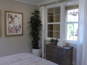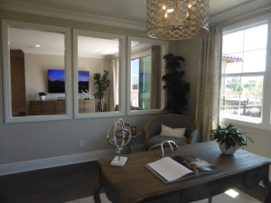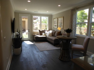 The living area is toward the back of the suite. It has two windows and a single French door facing the backyard. The room is shown with upgraded recessed lighting and pre-wire for the flat panel TV. The room also has direct access to the rest of the house. In the setup as modeled, there is not a door dividing the foyer from the living area and there is a door separating the living area from the main house. The same is true for the first option below, but the second option has a door at the foyer and an open walkway to the main house.