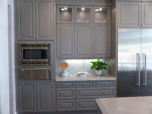 A doorway next to the microwave leads back to the area of the home with the most possible variations. All layouts include a walk-in pantry on the right and a two-door cabinet unit (upper and lower) on the left. The standard floorplan makes this a launch area with direct access leading into the storage area and garage. However, the model shows the prep kitchen, which is one of three options for this space. All options include the opening to the dining room, though the arched doorway is an upgrade from the standard opening. The wine cooler and glass doors shown in the original launch area are upgrades as part of the butler’s pantry package. Each option replaces the storage area of the garage.