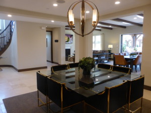 The dining room is directly behind the foyer. It is a large room and its openings to the foyer and kitchen make it easy to enlarge a table if needed for entertaining. There are three windows facing the backyard. The wall shown with upgraded rock styling is where the double doors to the wine room would be if that option is selected.