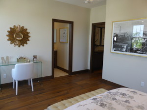 The master bedroom is just past the second vanity. Its main entrance is near the top of the stairs. The room is huge and has a full sitting area. There are three windows overlooking the backyard and two more on the side. Upgrades include 10 recessed lights and pre-wire for flat-panel.