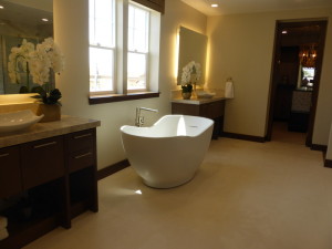 The master suite is in the opposite corner of the house. A long hallway at the top of the stairs leads back to the suite and is two steps higher than the rest of the second floor. Windows in the hallway face the balcony. There is a set of linen cabinets at the end of the hall, which actually include upper cabinets even though the model doesn’t show them. The master bathroom is also off the hallway. There are two vanities with a bathtub between them. The vanities are fully upgraded, as is the free-standing tub. There is a separate vanity in one corner with three drawers and room for a stool. The shower is very long, with a narrow seat at one end and a wider bench along the side. The tile, plumbing and hardware are upgraded. The closet is also quite long and is shown with upgraded built-in organizers; it also has two windows facing the street and two more on the side.