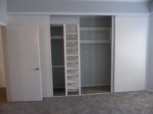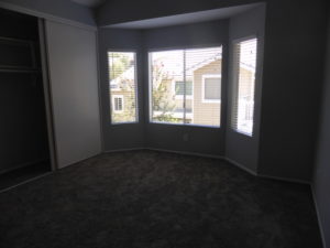 The master bedroom is on the left of the staircase, facing the front greenbelt. It has vaulted ceilings and, like the living room below it, it has three windows set at angles to each other similar to a bay window. The closet fills one whole wall of the bedroom and has four sliding doors. It has a built-in shoe rack in the middle; the shelves are angled so it wouldn’t really be able to hold anything besides shoes. Because of the large closet and the low height of the windows, there isn’t really a lot of wall space in the room, so it probably can’t fit a lot of furniture.