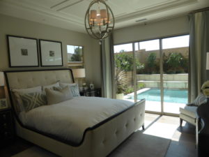 The master bedroom is a good size. It has two windows on the side and three more facing the backyard, though the model shows doors instead. The room has options for both standard sliding and multi-slide doors.