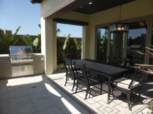 The outdoor room is long and narrow. The model shows the optional wet bar at one end, which is available in all configurations of the doors and even with the wine room. The backyard itself is quite small. Unfortunately, this model is built on an average sized lot, so the majority of Auburn homes will have yards this size. Some homes will be on premium lots, which will carry a higher price tag.