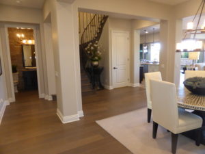 In the main house, the foyer has a single step up on the right leading to a hall closet with lots of storage under the stairs. Though the model shows an art display there as well, you’d have to choose carefully when putting something there so it doesn’t interfere with opening the closet door.