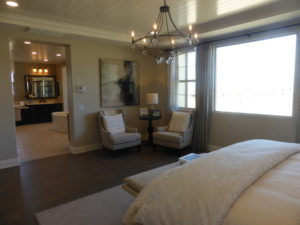 When you enter the master suite, there is a long hallway leading back to the room. The master bathroom is on the left as soon as you enter the suite, with an optional door separating it from the hallway. The shower is on the right as soon as you enter the bathroom. Though it isn’t as large as in the Seabrook model, it is still a very good size with a wide bench at one end. There are two vanities, each with a single sink, three cabinets, and two drawers. The bathtub sits between them. The model shows the standard tub but there is an option for a free standing tub instead. The walk-in closet is at the end of the room. It is a good size and is shown with built-in organizers. There is also a set of tall linen cabinets just outside the closet.