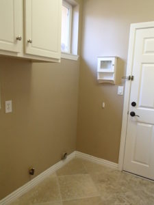 Off the back of the kitchen is the laundry room with the garage entrance. There is space for a side by side washer and dryer with some cabinetry and a small window above the appliances. Behind the door, to the right, are additional cabinetry and a sink.