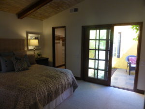 The master bedroom is just across the hall from the living room. It has a double door entry, exposed beams on the ceiling, and stenciled are on both the doors and ceiling. The bedroom has another set of sliding doors that lead to the atrium, but doesn’t have any other windows. One corner of the room has a walk-in closet, which has some shelves and drawers inside. This room also has brand new carpet.
