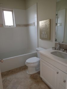 Both bedrooms are similar in size and each comes with a 3 door sliding door closet. Each bathroom has standard white countertops and cabinetry. A small window sits along the wall where the tub/shower combo is located. Each bedroom has custom paint, one with a cute trucks design and the other with a hot air balloon and planes. Both attached bathrooms are upgraded from the other property. Both have decorative tile backsplash with matching decorative tile in the tub/shower design. In addition, the tile flooring is nicer in 84 Kimbal.