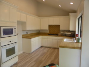 The kitchen is behind the dining room. It is u-shaped, with the oven, microwave, and fridge on the left, the stove in the middle, and the sink and dishwasher along the back wall. The cabinets are untouched since my visit. However, the kitchen now has quartz countertops and stainless steel appliances. There is a breakfast nook with a bay window facing the backyard. A counter with lower cabinets separates the kitchen from the family room. The sink shown in my pictures was removed when they replaced the counters. There are pantry-height cupboards next to the counter.