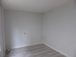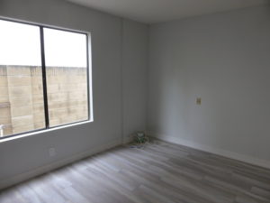 The other bedroom has a window facing the front of the house. The window is higher on the wall and not as tall as a standard bedroom window, but it is wider. This room has a ceiling fan with a light. It also has a by-pass closet but with the original, non-mirrored doors. This room is a little bigger than the other because the closet doesn’t take up as much space.
