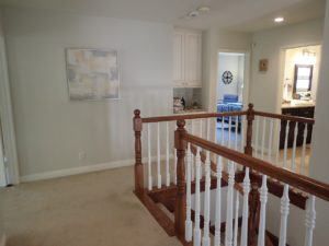 The stairs have carpet running down the center of stairs, with wood floor borders.  Carpet runs throughout the second floor hall and bedrooms.