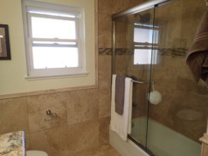 The shared bathroom has two sinks and a shower/tub combo.  Like the other bathrooms, new cabinetry, granite countertops, flooring, mirrors and lighting brighten the space.  The tub/shower surround has new travertine tile.  This model is the only one which originally sports dual sinks in the shared bathroom.