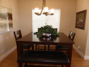 The dining room is behind the living room. The room is wide, but not very deep and can comfortable seat 6-8 people. It has a window facing the side of the home.
