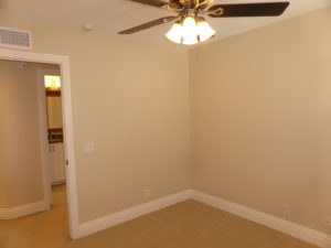 The second bedroom is similar to the first. It also a matching ceiling fan and another small window facing the side of the home. The closet also has wide, sliding doors (original) and a wire shelving system.