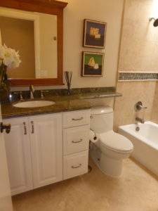 There isn’t a door separating the bedroom from the bathroom. The new vanity has granite countertops, two sinks, and darker cabinetry than the rest of the home. Each sink has its own set of cabinets and there are three shared drawers. A framed mirror matches the cabinets. The shower is through a separate door. Its upgrades include a new tile surround, plumbing fixtures, and a glass enclosure. The shower has a corner seat and shelf. The small window is the only new window in the entire home.