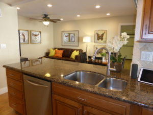 The kitchen and family room are at the back of the house. The kitchen is on the right side and has been fully upgraded. The granite and cabinetry match the bathroom. It is narrow and u-shaped, with the sink and dishwasher on the left, the range and microwave at the back, and the refrigerator on the right. A set of pantry-height cupboards sit next to the fridge. Though small, the space is utilized well. The wide countertop has seating on the other side.