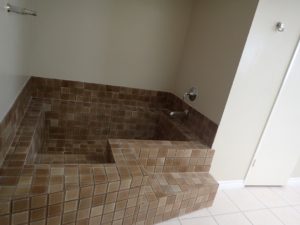 Up two stairs, is a landing with the master bathroom. Further past the landing, down two steps, is the master bedroom. Again, the layout was dated and odd, but the bathroom and bedroom were spacious. With original brown tile, fluorescent lighting, and a sunken tub with brown tile lining the tub itself, the bathroom screamed the 1970’s. It has a lot of potential with the size of the room and the buyer can remodel it as they desire. Behind the dual sinks is a large walk-in closet which expands the length of the bathroom. After coming down two steps, the master bedroom is large and roomy. It feels extra spacious with large windows, a sliding glass door and vaulted ceilings. The carpet bubbled in some areas, as throughout the rest of the second floor. The sliding glass door opens up to a large balcony overlooking the backyard.