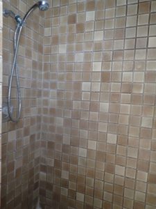 The downstairs bathroom is remodeled with new flooring, tub surround, sink and lighting, however the grout looks sloppy and the flooring next to the bathtub looks like it has had some water build up. Although it has nice tile, the details make the space look a bit sloppy.