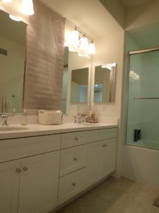 At the end of the hallway is the master bedroom. There is an abundance of natural light flooding the room with two large windows facing the front of the house and two smaller windows on the perpendicular wall. It is a good sized bedroom with a walk-in closet. The master bathroom is found beyond a preferable privacy door and has dual sinks with a small window sitting between the two sink mirrors. Again, the bathroom is basic with white cabinetry and white counter tops and white square tile tub surround. It is in excellent condition. I did not see any extra closet for linens/bath towels.