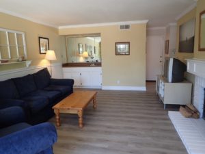 The rectangular family room is standard with the original brick fireplace painted white, and sporting a new mantel. To the left is the sliding glass door leading out to the backyard. In the opposite back corner is small wet bar with a built-in sink and cabinets. There are no ceiling lights in the room.