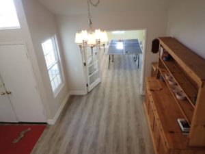 The front door is located on the side of the home. Upon entry, a short hallway and the staircase are directly in front of you and the step-down living room is to the right. To the left is the dining room, which fits a good size table and sits in front of the large add-on and entrance into the kitchen. The living room and entrance have vaulted ceilings. There is plenty of natural light flooding the rooms. The first floor has newer wide planked wood-like tile flooring.
