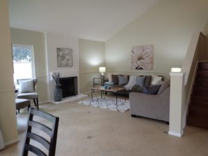 The living room opens up to the dining room, both with vaulted ceilings. It is a nice, open space overlooking the backyard. The living room’s brick fireplace has been painted white.