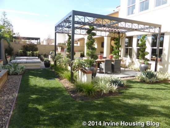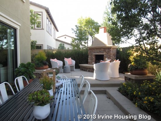 The backyard of this home shows the true difference between the lot sizes. Phases 1-5 will have yards the same size as in the model, which shows a two-level grassy yard and smaller patio with a built-in barbecue. Phases 6-11 will have yards only as big as the lower portion of this one. The back wall would be where the two stairs are. The difference is significant.
