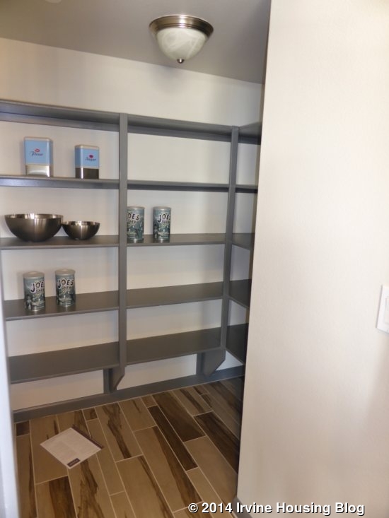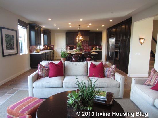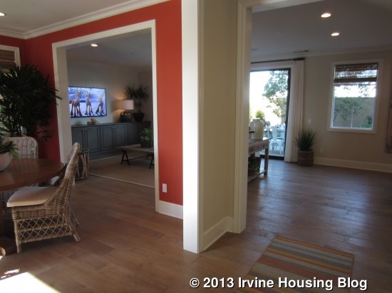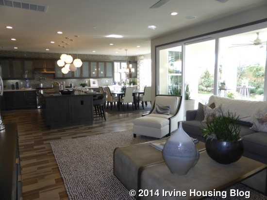 I liked the layout of this house, including the extra sitting room downstairs. I think the three-car garage will be appealing, even though it includes a tandem spot. As always, the downstairs bedroom is popular among many buyers. Those who can secure a spot in phase one will enjoy some of the biggest yards I’ve seen in all of Irvine’s new construction in the last several years. Residence One doesn’t have a lot of options in terms of layout; all of the rooms are set as modeled and cannot be converted to something else. The fireplace in the great room and accordion doors leading out to the retreat are the only real options aside from decorative features.